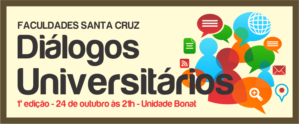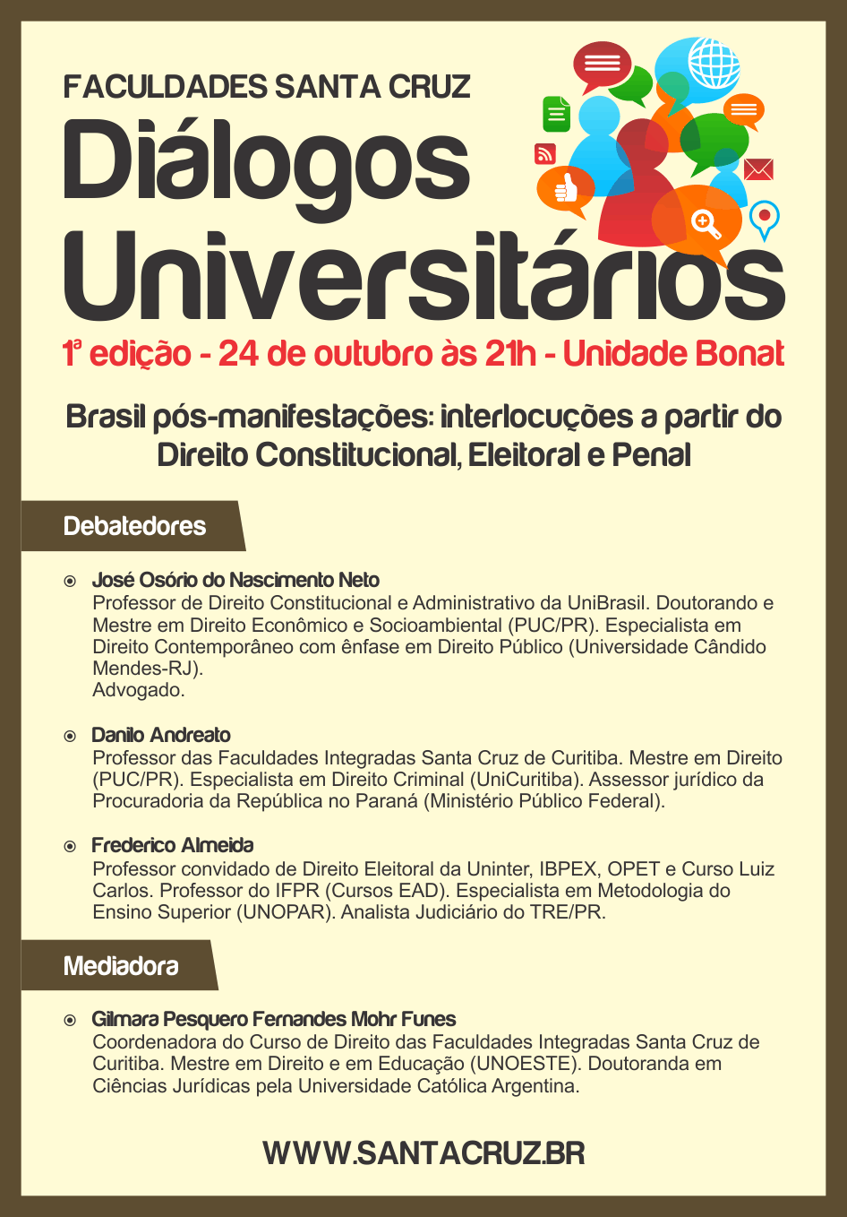 O Curso de Direito das Faculdades Santa Cruz promoverá para os graduandos e docentes da instituição a primeira edição do Diálogos Universitários, com o tema “Brasil pós-manifestações: interlocuções a partir do Direito Constitucional, Eleitoral e Penal”. Será às 21h do dia 24/out (quinta-feira), no Auditório José Antonio Soares, na Unidade Bonat, em Curitiba. A entrada é franca. Serão emitidos certificados para comprovação de horas a título de atividade complementar.