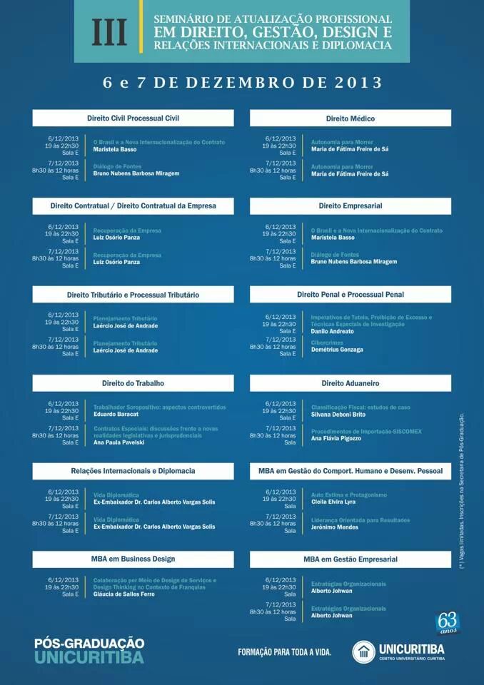 Ocorrerá no Centro Universitário Curitiba (UniCuritiba) o III Seminário de Atualização Profissional, que contará com exposições de temas alinhados aos interesses de cada um dos seus cursos de pós-graduação lato sensu.