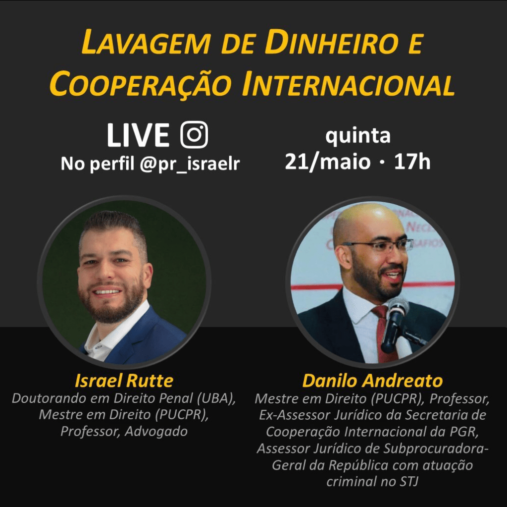 Nesta quinta-feira (21.05.2020), às 17h, participarei de live no Instagram com o meu amigo Israel Rutte. O tema será Lavagem de Dinheiro e Cooperação Internacional.
